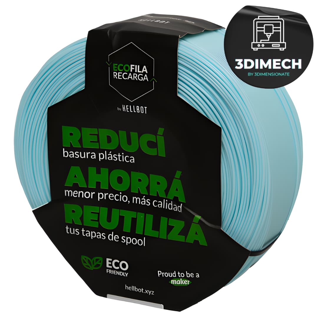 La presentación recarga viene sin carrete, lista para usarse con el spool reutilizable Hellbot. Este formato ecológico permite reducir el consumo de plásticos, manteniendo la calidad, el rendimiento y la facilidad de impresión característica de la línea Ecofila.